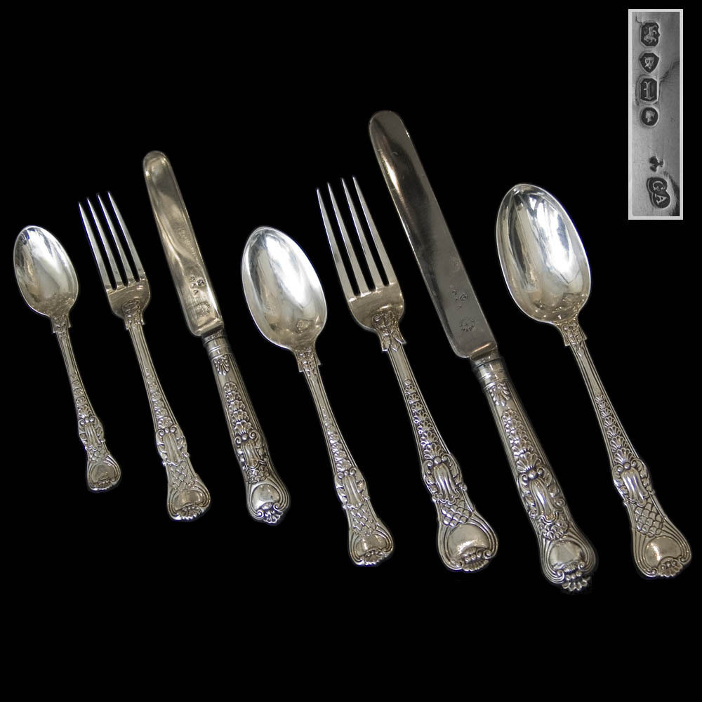 A rare Victorian silver set for twelve of Coburg pattern flatware all by George Adams except for 1 table fork and 1 table knife by Henry Holland.