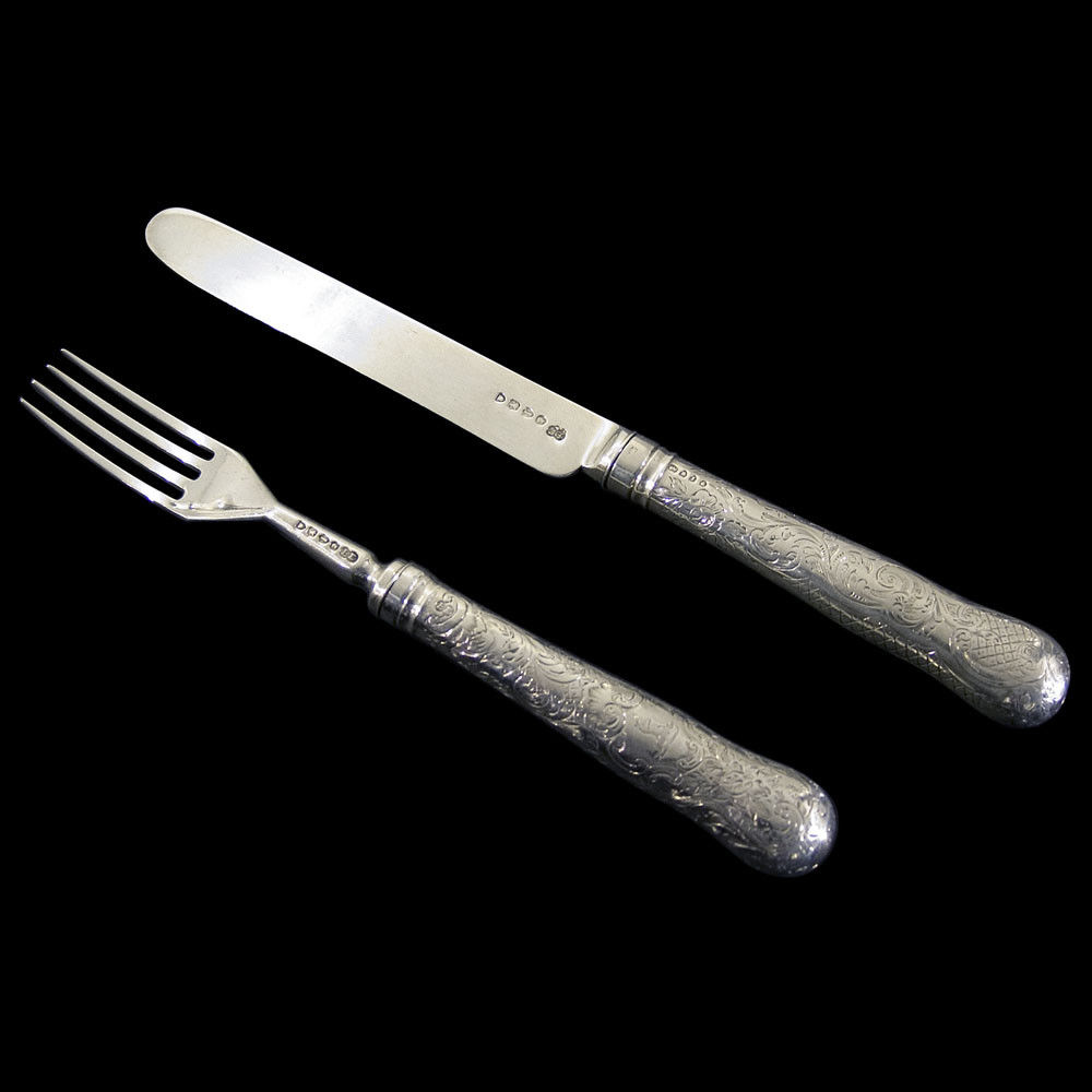Six pairs of Victorian dessert eaters with silver blades and tines. The silver handles engraved with family crest and elaborate floral design.