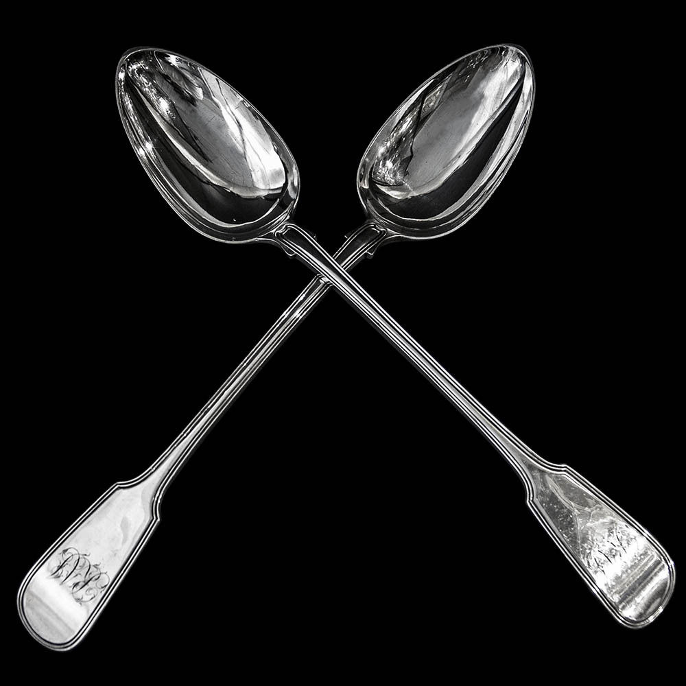 A pair of George IV sterling silver Fiddle & Thread pattern basting spoons engraved with original monograms